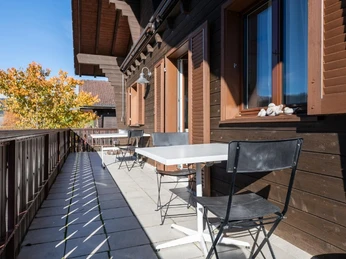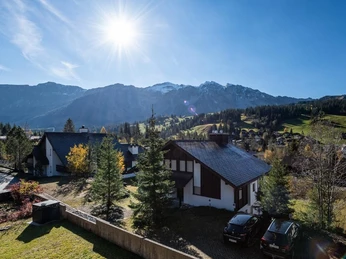 Outside, a large garden seating area, which extends across the entire width of the house, invites you to linger. Here you can enjoy the sun and relax at the end of the day. The flat also has a covered and an open parking space and shares a ski/bike room with the flat on the upper floor, which is particularly practical for active holidaymakers.