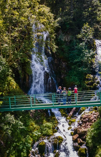 Past the viewpoint begins the descent towards Eisee. The small mountain lake lies at the foot of the Arnihaaggen, embedded in a mosaic of scree slopes and green meadows. The lakeshore invites for a first break. Those who dare can cool their feet in the icy cold mountain lake before tackling the descent towards Emmensprung. The path snakes further downhill in several switchbacks until the Emmensprung is reached at 1465 m altitude. As if from nowhere, the spring water bubbles out of the ground and finds its way into the valley, where it finally flows into the Waldemme. Just a few meters further, you will discover two waterfalls in the middle of a small forest, where water gushes down moss-covered rocks.