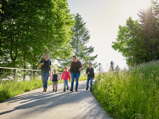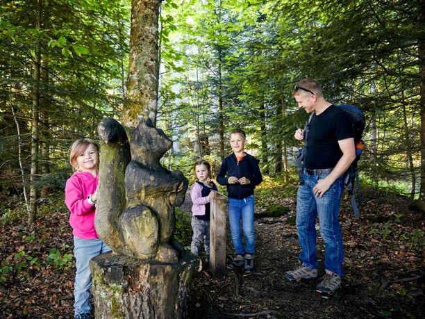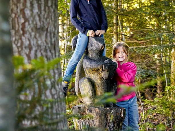 Shortly after the Hotel Kurhaus Heiligkreuz, the fairy tale trail leads into the forest. The first section of the 1.5km long circular trail runs through the forest. Shortly before you leave the forest via a small suspension bridge, you reach a small pond with a charming view of the pilgrimage site Heiligkreuz. Directly after the suspension bridge there is a nice barbecue area. Follow the path to the road and turn right. The road leads you back to the Kurhaus Heiligkreuz.