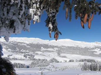 When the flag is up at Alp Schlund, refreshments are available at the small mountain restaurant – a coffee with schnapps is the perfect drink to warm you up on cold winter days. The trail continues through a scenic forested section of gnarled mountain pines and spruces. Time and again, you can catch a glimpse of the Giswilerstock, the Brienzer Rothorn range or the “Böli”. The snowshoe tour ends at the foot of the imposing rock formations of the Schrattenfluh. The route continues moderately uphill, as the forest thins out. Other rock formations of the Schrattenfluh come into view, notably the Schibengütsch, which is soon clearly visible to the right of the Böli. Pass it, and you’ve made it! Tugged away on the other side, lies the Chlushütte. Every drop of sweat will be well worth it – the panoramic views from the Chlus are spectacular: The Brienzer Rothorn range and the Bernese Alps present themselves on a silver platter. Eiger, Mönch and Jungfrau, Schreckhorn and Finsteraarhorn – to name but a few of the imposing Alpine peaks.