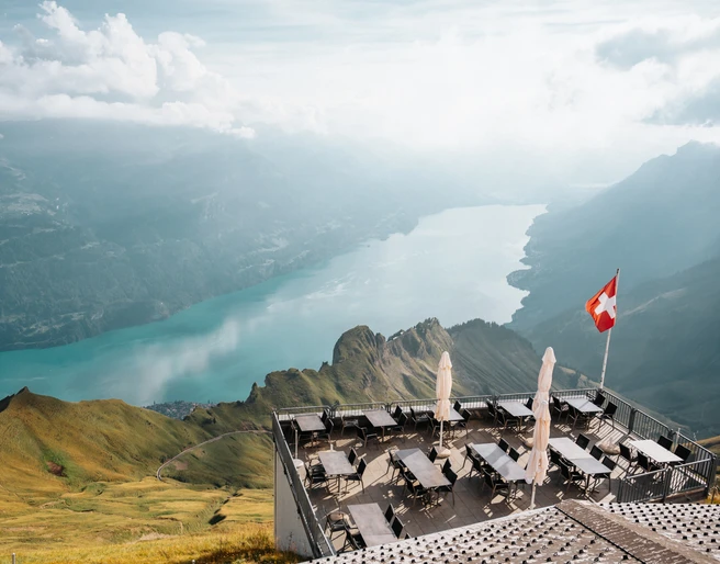 Le trajet en téléphérique de la vallée au Rothorn de Brienz, à 2350 m d'altitude, est déjà spectaculaire. Le regard porte loin au nord sur la vallée de la Walde et, par temps clair, sur le Napf et le paysage lacustre qui se trouve derrière, même jusqu'à la région de la Forêt-Noire. Et à l'arrière, le lac de Brienz bleu turquoise et les Alpes bernoises enneigées avec l'Eiger, le Mönch et la Jungfrau et 690 autres sommets, tout simplement à couper le souffle.