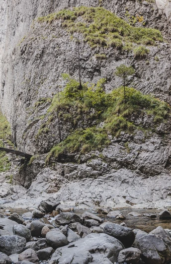 On revient ensuite au chemin de gravier, bientôt la première plateforme d'observation s'offre, dévoilant un paysage aquatique époustouflant que le Rotbach a façonné au fil des siècles. Un paradis pour géologues comme pour amoureux de la nature. Des plantes comme la bardane, les centaurées, le géranium des bois et d'autres fleurs sauvages colorent le chemin, et bientôt on découvre une belle aire de pique-nique « Famille suisse » avec barbecue. Au travers de la forêt on aperçoit une autre aire de barbecue directement au bord de la rivière. Plusieurs itinéraires de randonnée peuvent être pris à partir d’ici, mais c’est la célèbre cascade Chessiloch qui attire inévitablement en premier, indiquée à 10 minutes par le panneau. Le chemin devient un peu aventureux, montant et descendant sur des pierres et racines. Après quelques minutes, la cascade spectaculaire apparaît, surplombée par une plateforme d'observation. Quelle force naturelle impressionnante ! On continue ensuite en montée et bientôt on aperçoit un pont suspendu en bois qui enjambe le ravin. Un bruit assourdissant de cascade devient de plus en plus fort. À la fin du pont, le grand effet wow : vue grandiose de la cascade Chessiloch qui se jette dans le vide en rugissant et nous asperge de brume légère.